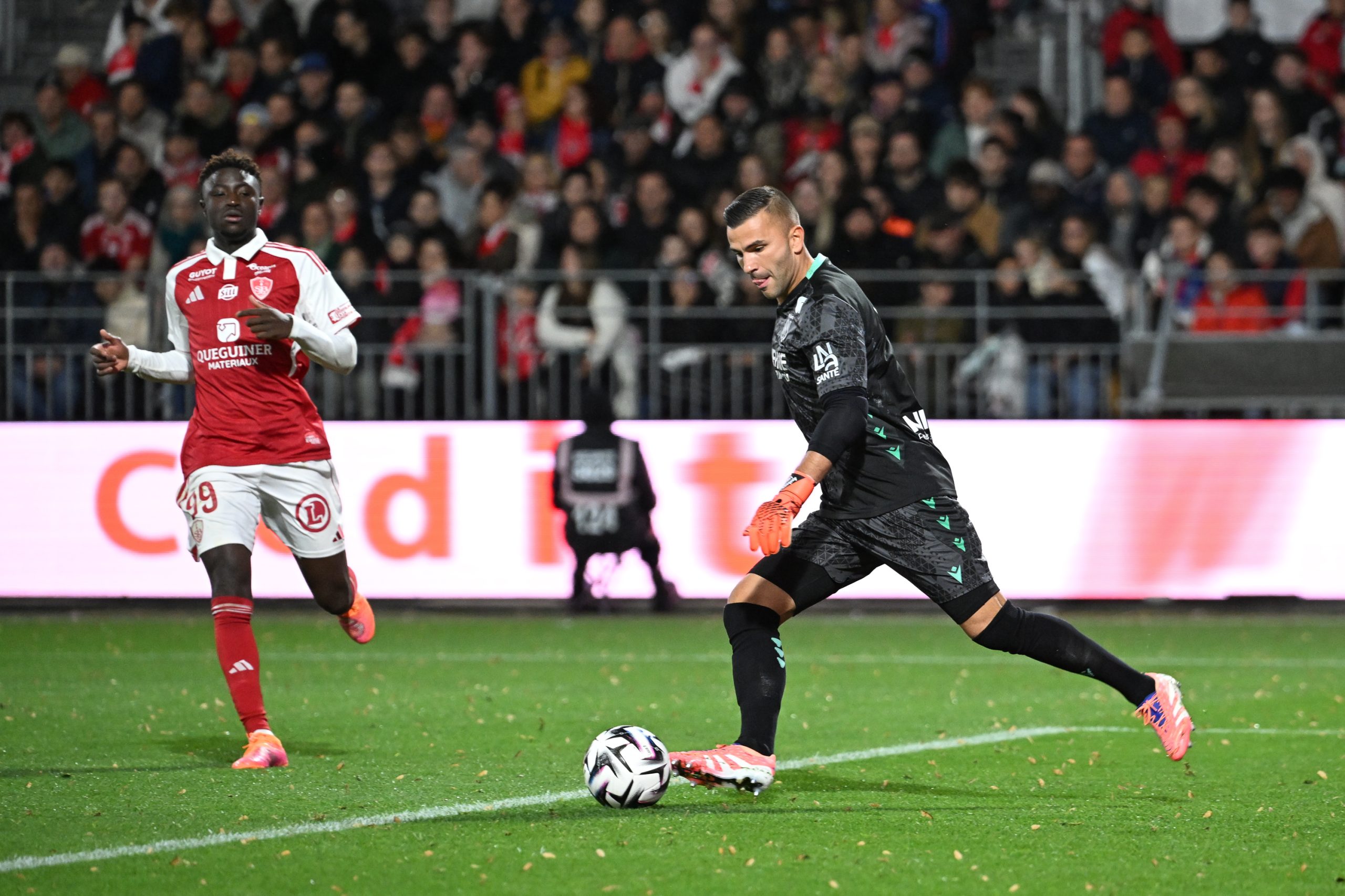 À la 38e, Brest se montrait à nouveau dangereux. Éric Junior Dina Ebimbe surgissait lancé dans la surface pour placer une tête piquée, parfaitement servi depuis le côté gauche. Mais le portier nantais, toujours réactif, s’allongeait sur sa gauche et captait fermement le ballon.